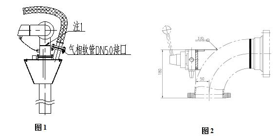原鶴管從圖1中將注1垂管連接件(包含旋轉(zhuǎn)接頭法蘭、彎頭、鋼法蘭)整體更換成圖2所示零部件。配件由賣方提供。如右圖2所示: